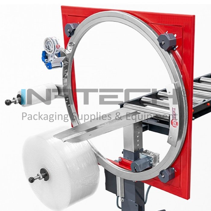 Dispenser Pentru Folie compatibil cu Masinile De Ambalat Colete, utilizat pentru infolierea cutiilor din carton. Dispenserul este fabricat din metal si ofera o rezistenta ridicata. Acest dispenser din metal pentru folia stretch ajuta la pozitionarea, aplicarea rapida si intinderea uniforma a foliei stretch pe palet.