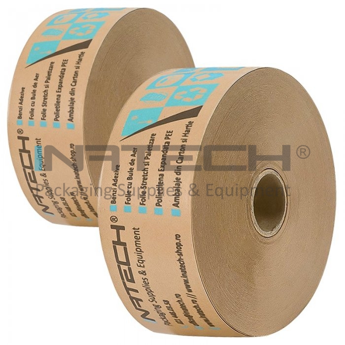 Banda Umectibila Personalizata este un produs din hartie kraft cu adeziv pe baza de amidon ce se activeaza la umezirea cu apa.