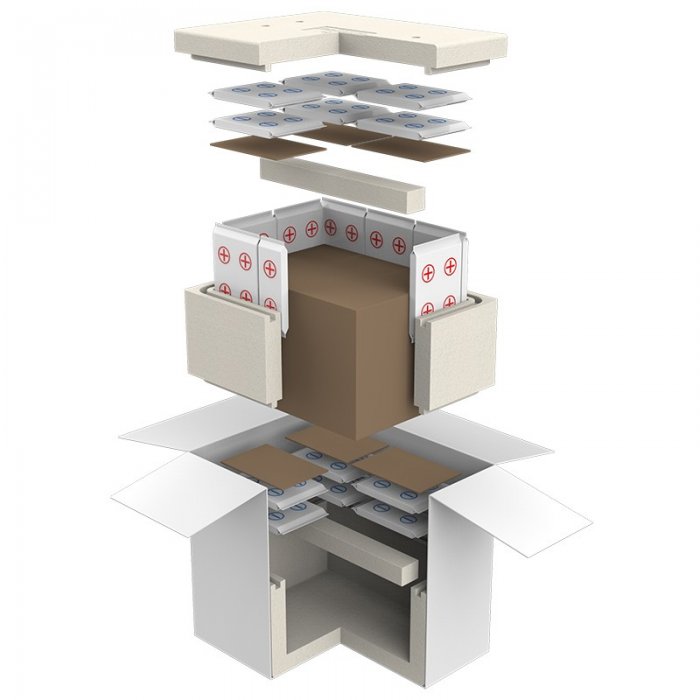 Sistemul este compus din: cutie carton exterior, cutie polistiren, cutie carton interna pentru produse, separator carton si rezerve pentru racire pe baza de apa din spuma.