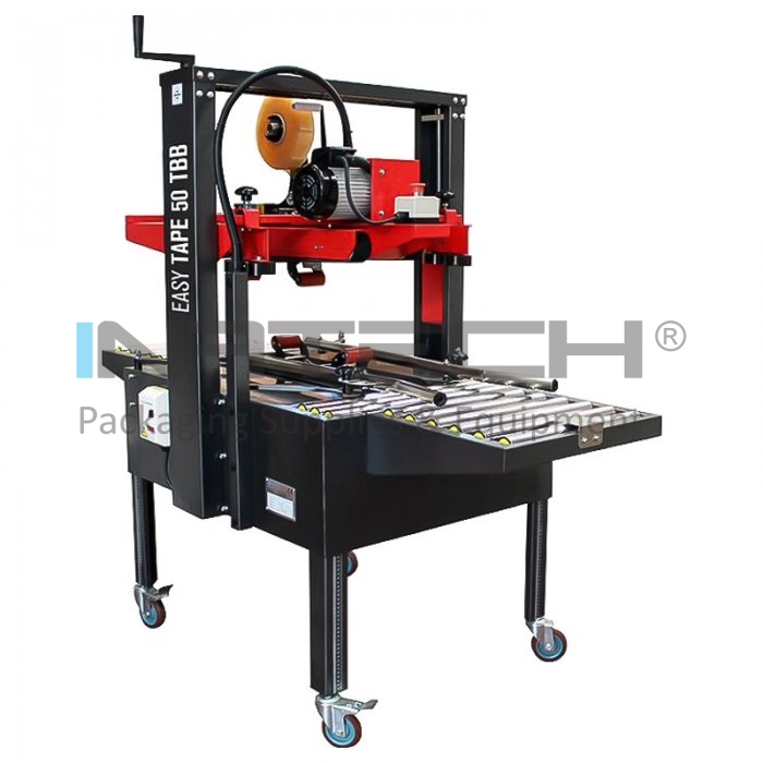 Mașina de sigilat cutii Easy tape 50 SB sigileaza partea inferioara si superioara a cutiei cu banda autoadeziva. Este echipat cu un sistem de inchidere cu 3 clape pentru a facilita operatia de inchidere. Masina poate fi utilizata de operatori nespecializati, deoarece necesita operatii de reglare foarte simple. Sigilarea cutiei are loc prin intermediul a doua curele laterale de actionare (actionate de doua motoare), asigurand o uniformitate maxima. Rezultatul este o aliniere perfecta a clapelor si, prin urmare, o etansare optima, care este realizata de capetele de lipire performante.