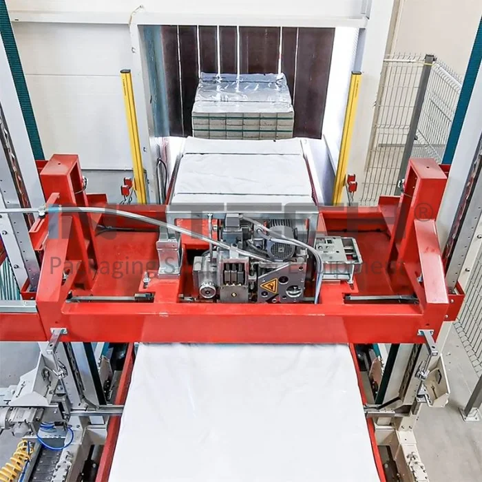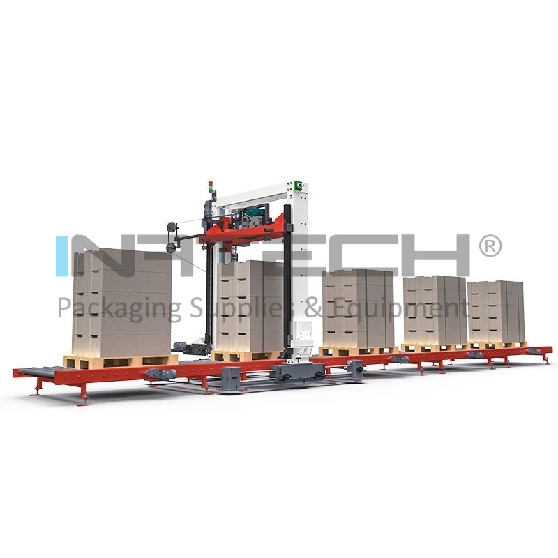 Masina Automata Pentru Legarea Verticala A Paletilor este destinata legarii verticale a paletilor cu banda PP sau PET. Este proiectata pentru linii industriale si de productie speciale, precum si pentru linii automate de ambalare. Echipamentul este special conceput pentru aplicatii industriale unde este necesara o eficienta ridicata, cum ar fi industria betonului sau alte linii de productie grea. Designul cu cadru deschis permite introducerea benzii deasupra nivelului transportorului si utilizarea transportoarelor cu role. Paletii intra in masina pozitionati longitudinal si raman suspendati intr-o singura pozitie pe tot parcursul procesului de legare.