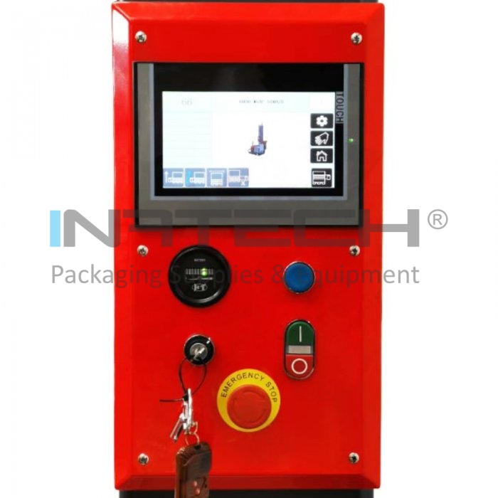 Miscarea robotului de infasurare a paletilor are loc automat datorita celor 2 comenzi pozitionate pe carma de ghidare. Robotul este prevazut in partea din fata cu o bara de protectie de siguranta care permite oprirea imediata in caz de ciocnire cu un operator sau un obstacol .