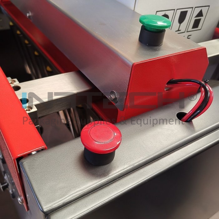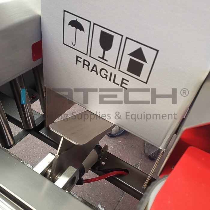 Distanta dintre legarile cu banda poate fi ajustata prin reglarea fotocelulelor care detecteaza cutia din carton. Masina de format, legat si sigilat cutii din carton are o viteza de transfer de 22 m/min si este alimentata atat electric, cat si cu aer.