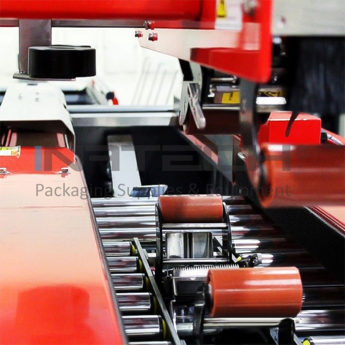 Modelul Pack Former 50 SB este o statie eficienta de formare, sigilare si legare a cutiilor de carton. Procesul de ambalare este simplu: cutia este glisata spre sigilarea automata cu banda adeziva, apoi spre legare cu banda PP. Sistemul include transportorul cu role de evacuare.